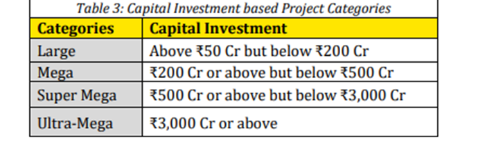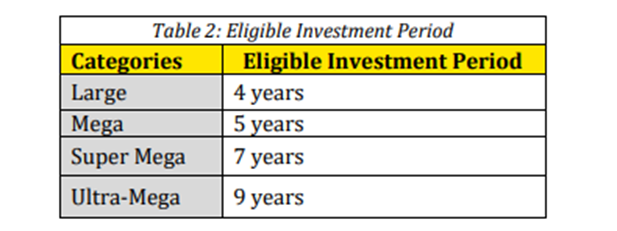 Period means the period commencing from the cut-off date falling in the Effective Period of this Policy up to 4 years or till the date of commencement of commercial production, whichever is earlier for Large projects; up to 5 years or till the date of commencement of commercial production, whichever is earlier for Mega projects; up to 7 years or till the date of commencement of commercial production, whichever is earlier for Super Mega projects; and up to 9 years or till the date of commencement of commercial production, whichever is earlier for Ultra Mega projects.